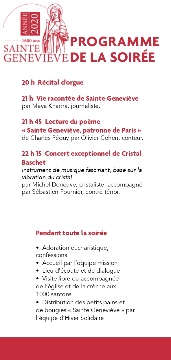 Concert exceptionnel de Cristal Baschet pour l’année Sainte Geneviève Pour l’année Sainte Geneviève, l’Eglise Saint-François Xavier ouvre ses portes le Samedi 25 Janvier pour une soirée de rencontres, de prières, de conférences. + Add to Google Calendar + iCal / Outlook export Date Jan 25 2020 Expired! Time 22 h 15 min Location Eglise Saint-François-Xavier 12 Place du Président Mithouard, 75007 Paris Share this event